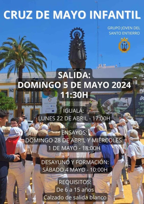 La Cruz de Mayo Infantil de la Hermandad del Santo Entierro, tendrá lugar el domingo 5 de mayo de 2024 a las 11:30 h., La Iguala se realizará el lunes 22 de Abril a las 17:00 h. Los ensayos serán, domingo 28 de abril y miércoles 1 de mayo a las 18:00 h. El desayuno y la Formación el Sabado 4 de mayo a las 10:00 h.
