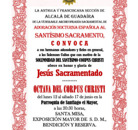 La Venerable Archicofradia de la Adoración Nocturna Española al Santisimo Sacramento convoca a sus hermanos Adoradores y fieles en general, a los Solemnes Cultos que con motivo de la Solemnidad del Corpus Christi ofrece en honor y gloria de JESÚS SACRAMENTADO.
