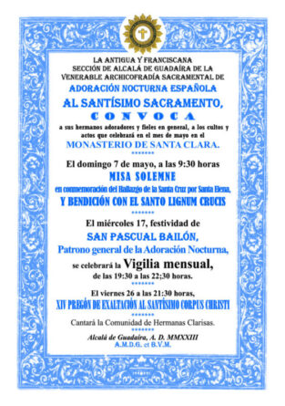 La Archicofradia Sacramental de la Adoración Nocturna de Alcalá de Guadaira con sede canonica en el Monasterio de Santa Clara en C/Ntra. Sra. del Aguila, convoca a los adoradores y fieles en general a los Cultos que se celebrarán el domingo 7 de mayo a las 9:30 h. de la mañana comenzando con una MISA SOLEMNE en conmemoración del hallazgo de la Santa Cruz por Santa Elena, y Bendición con el Santo Lignum Crucis.