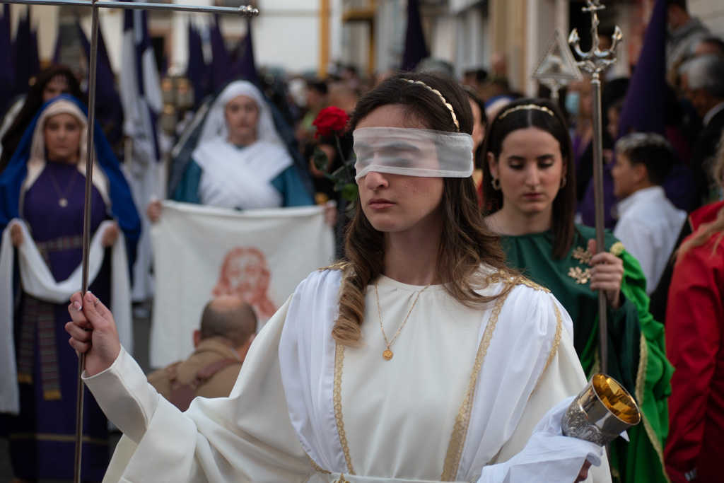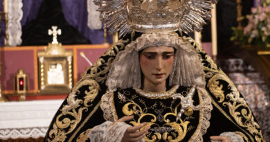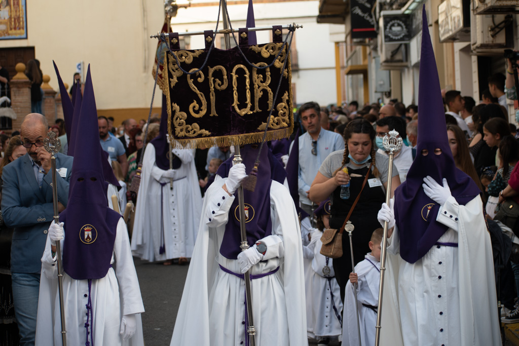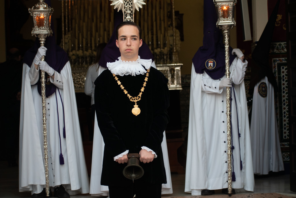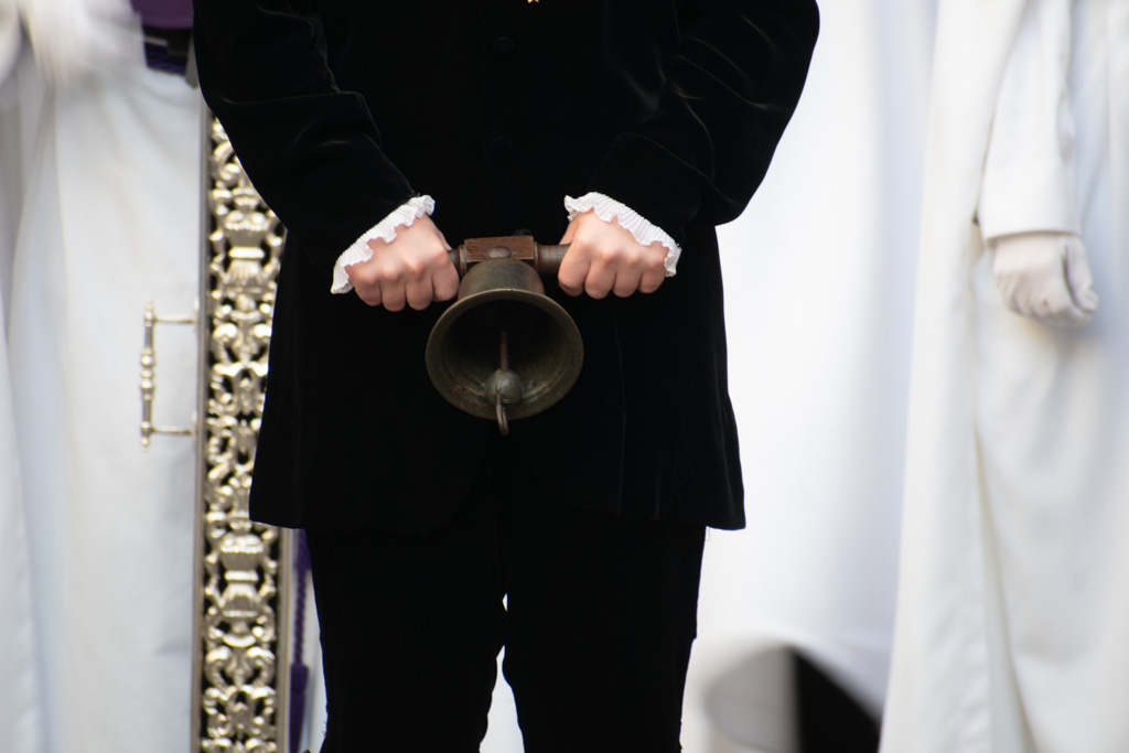 Al llegar al patio de los Salesianos, alza uno la cabeza, para buscarlos a todos, y desearles buena estación de penitencia. Ya son las 8, toque fúnebre en el campanario, sale el Triunfo, suena la banda, ha salido la Urna; ya llega nuestra hora, entro en la Capilla, ya casi vacía, solo quedan acólitos y manigueteros, antes de meterme debajo, busco el mejor de los ángulos, para verla, último rezo y petición de que todo salga bien, ya suena el llamador.