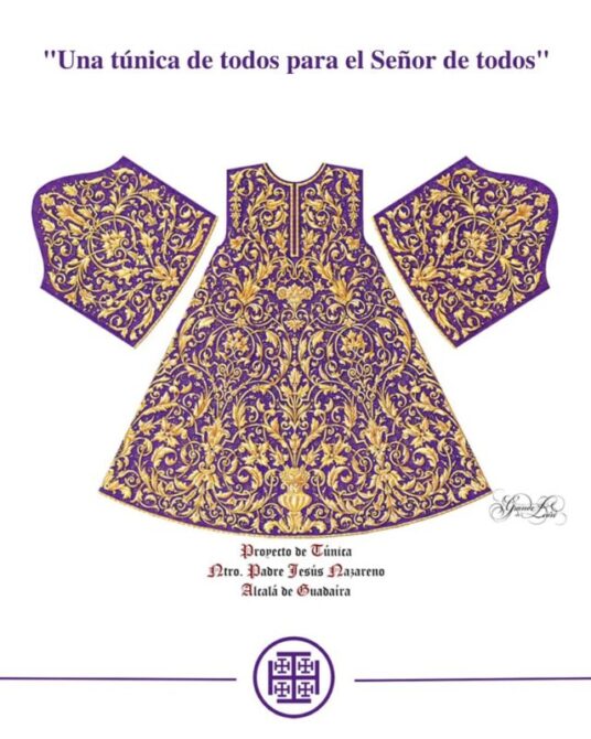 La obra ha sido diseñada y será realizada por N.H.D. José Antonio Grande de León. La pieza es de estilo neobarroco con la ornamentación siguiendo las lineas regionalistas. Hojas de acanto, macetillas, jarras y jarrones adornan el diseño. La túnica será bordada sobre terciopelo morado en oro fino de primera calidad siguiendo una compilación de las mejores técnicas del bordado.