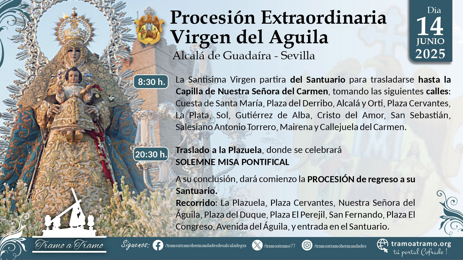 El próximo 14 de junio, se conmemora la Coronacion Canonica de Santa Maria del Aguila Coronada. Con motivo de ello, a las 8:30 h. de la mañana, la Santisima Virgen partira del Santuario para trasladarse hasta la Capilla de Nuestra Señora del Carmen, tomando las siguientes calles: Cuesta de Santa María, Plaza del Derribo, Alcalá y Orti, Plaza Cervantes, La Plata, Sol, Gutiérrez de Alba, Cristo del Amor, San Sebastián, Salesiano Antonio Torrero, Mairena y Callejuela del Carmen.