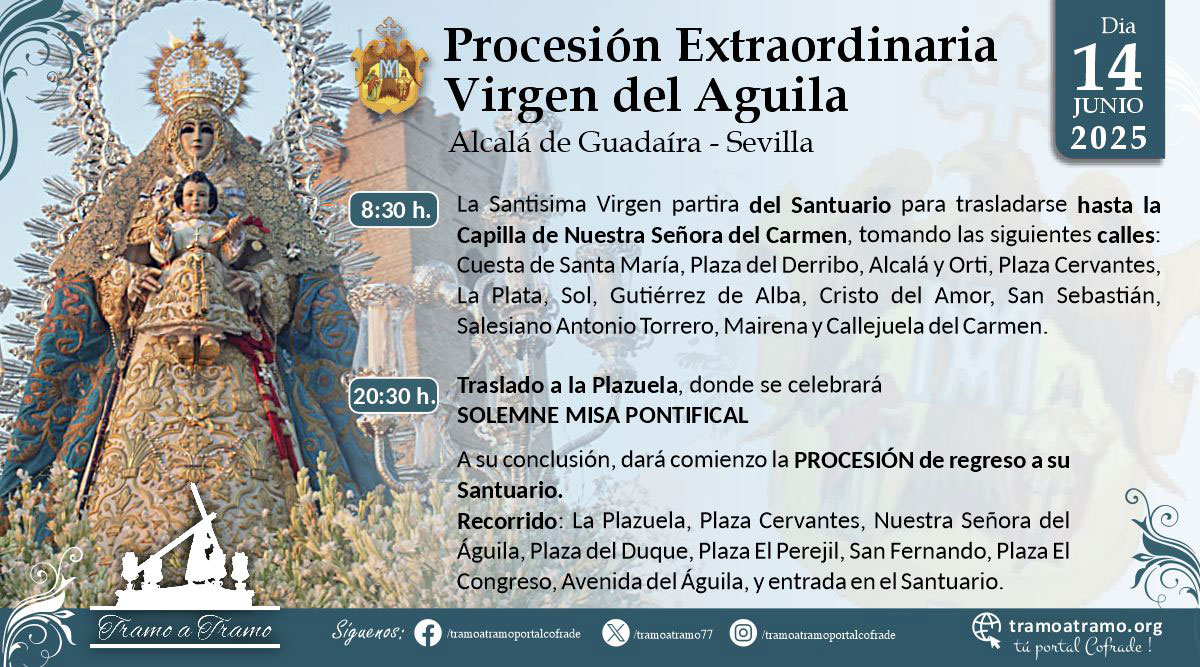 Santa María del Águila Coronada celebrará Solemne Triduo de Acción de Gracias con motivo del XXV del Aniversario de su Coronación Canónica. Durante los días 11, 12 y 13 de junio a las 20:30 h. en el Santuario de Santa María. El día 14 de junio a las 8:30 h. de la mañana, se procederá al traslado de la Santísima Virgen del Águila a la capilla de Ntra. Sra. del Carmen. A las 20:30 h., en la Plazuela, misa pontifical. A su conclusión, comenzará la triunfal procesión de la Santísima Virgen hasta el Santuario.