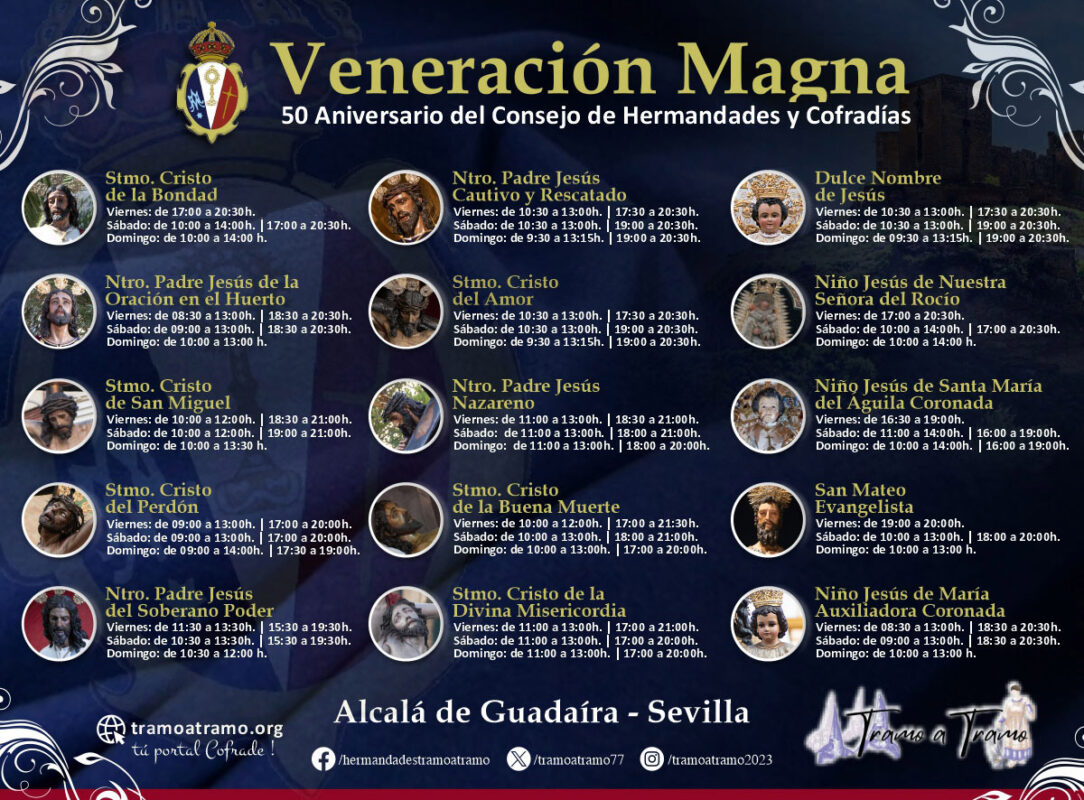 Durante los dias 24, 25 y 26 de noviembre de 2023, Solemnidad de Jesucristo Rey, el Consejo General de Hermandades y Cofradias de Alcalá de Guadaira organizara una veneración magna de las hermandades Alcalareñas en todos los Templos de nuestra Ciudad, que exponen a la veneración, las Imágenes del Señor, y del Patrón San Mateo, con motivo del Cincuentenario del Consejo de Hermandades.